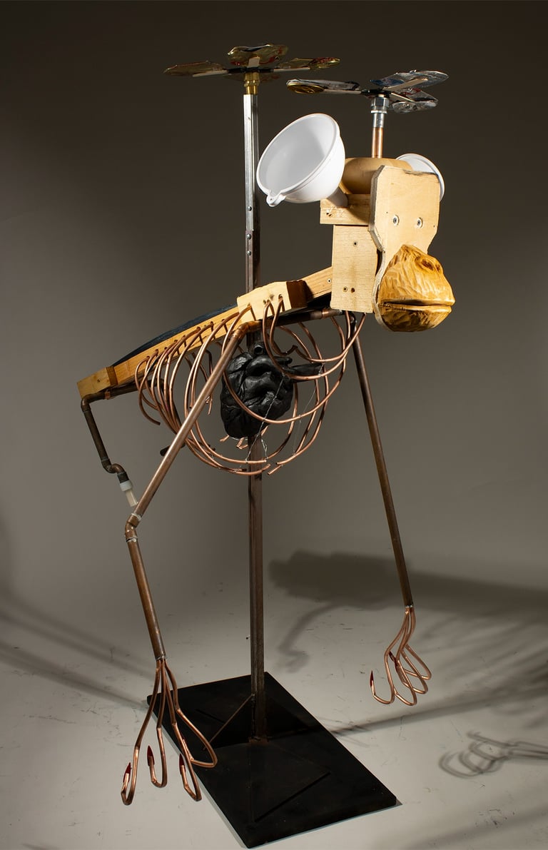 Flying Monkey, Prototype. Wood, steel, copper, plastic and aluminum cans. 50h x 28w x 40d in. 2026