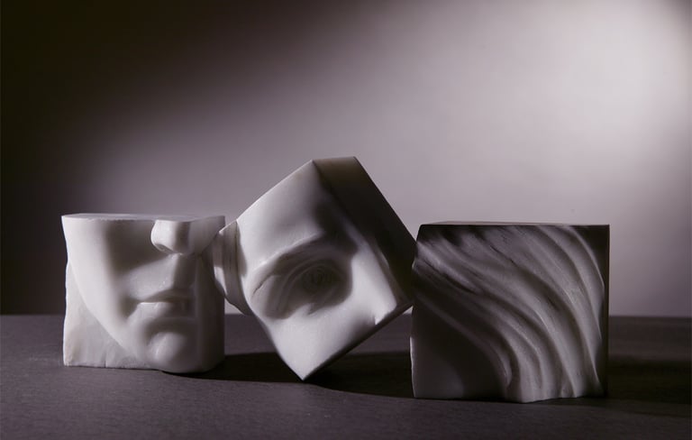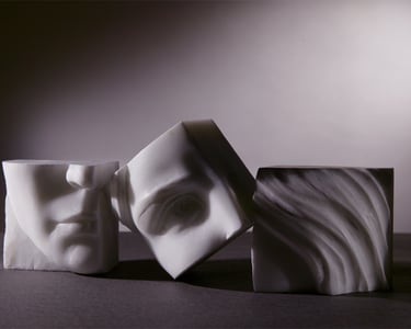 A metaphorical exploration of mutable identity through rearrangeable sculptural cubes, embodying the fluid architecture of selfhood.